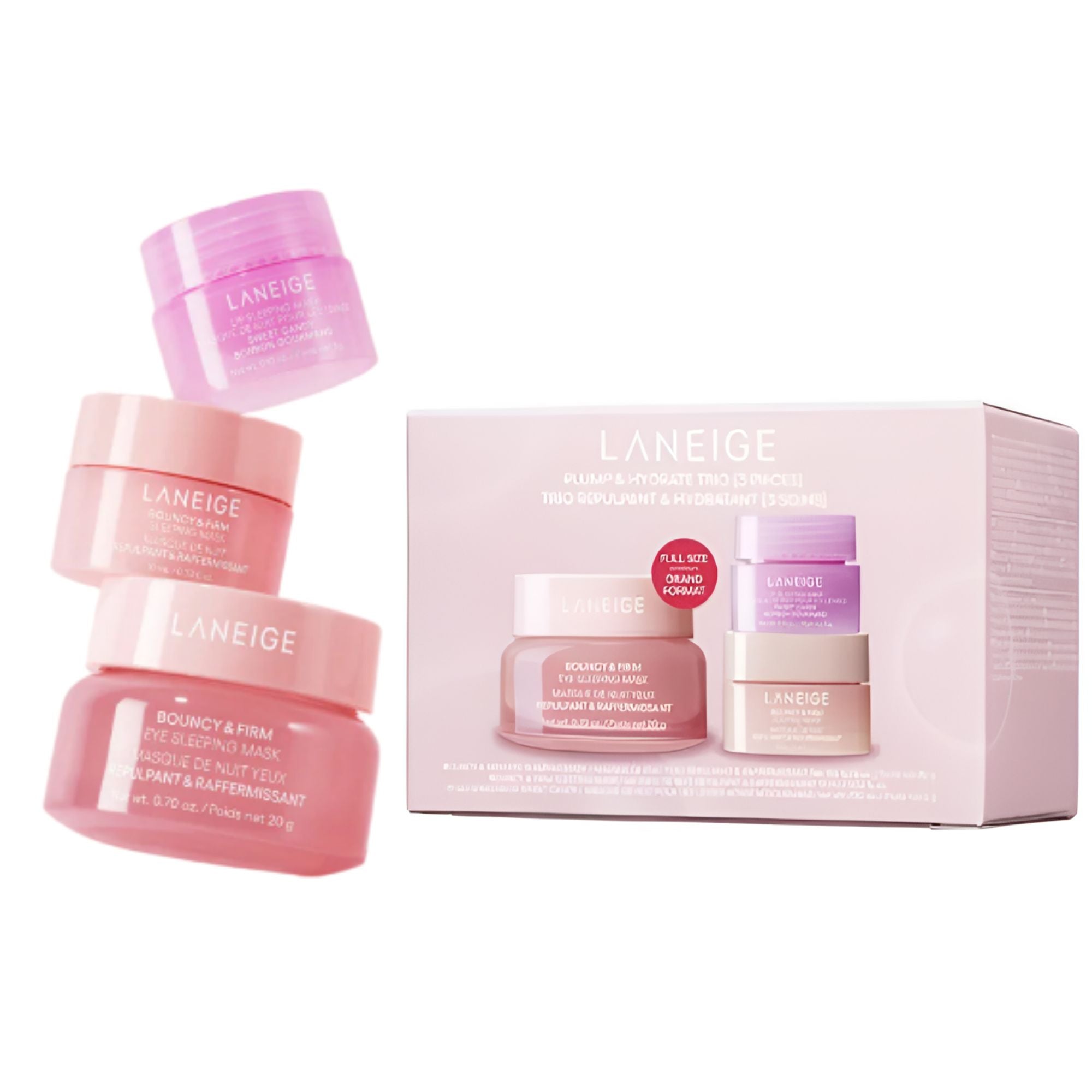 • Glowy, plump-looking skin and lips just got easier—introducing the LANEIGE Plump & Hydrate Trio! This limited edition set includes a full size Bouncy & Firm Eye Sleeping Mask along with minis of the Bouncy & Firm Sleeping Mask and Lip Sleeping Mask Sweet Candy!